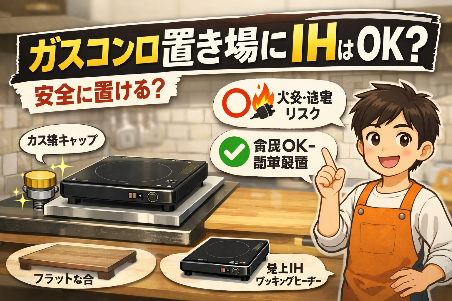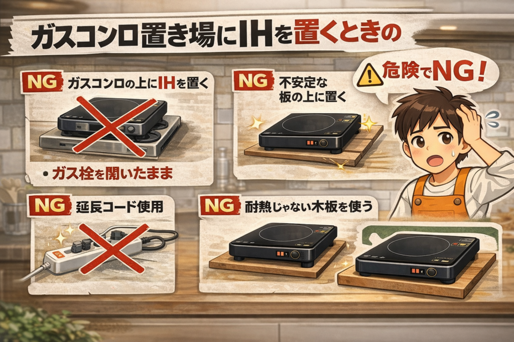 ガスコンロの置き場に、IHを直置きするのはNGです。