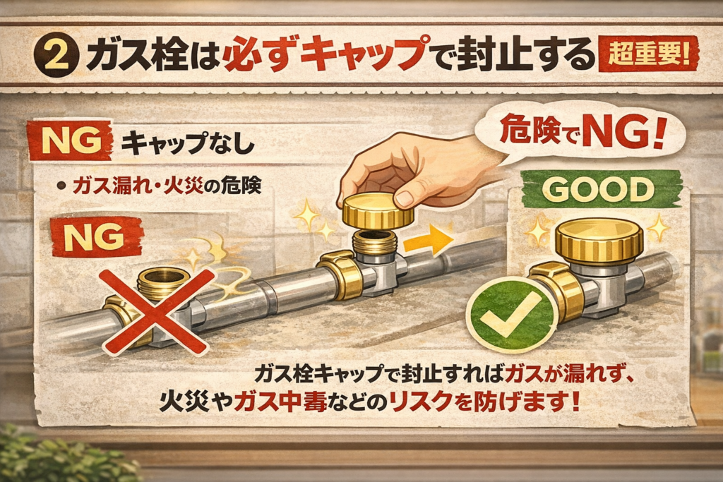 ② ガス栓は必ずキャップで封止する【超重要】